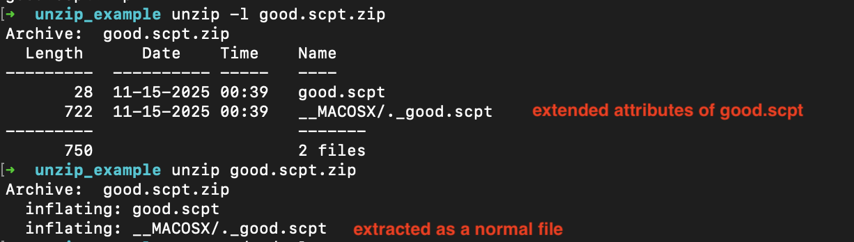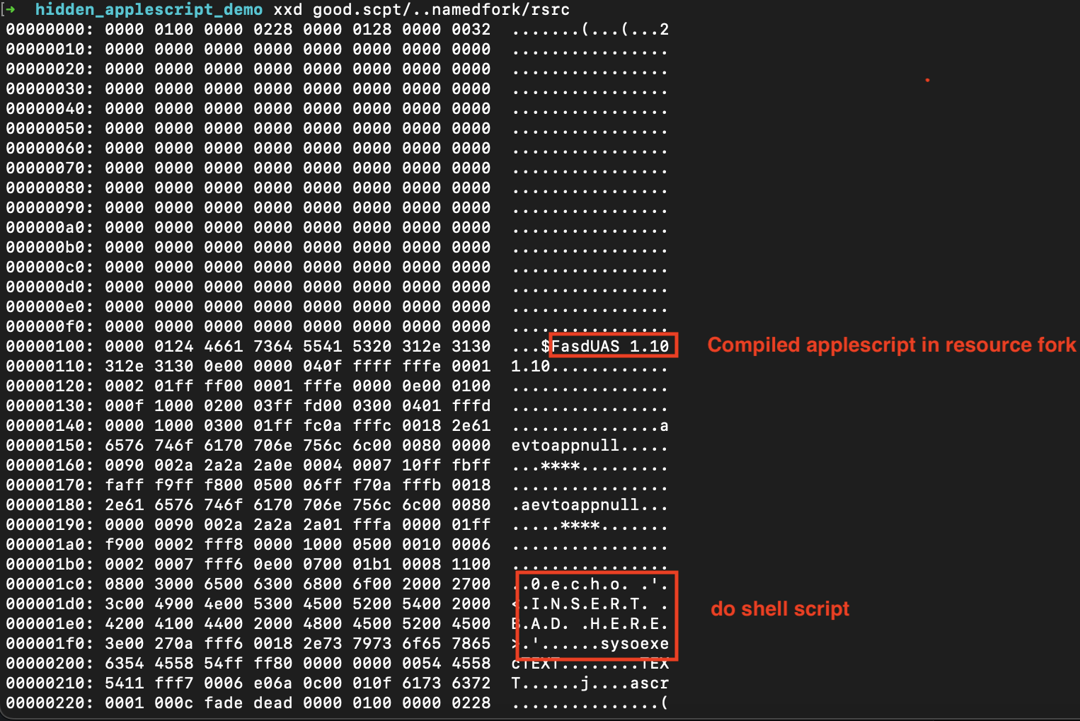 A notable difference between this technique versus the one described in SentinelOne’s example, is that the payload doesn’t need to be extracted from the resource fork. osascript will automatically detect the hidden payload and execute it.