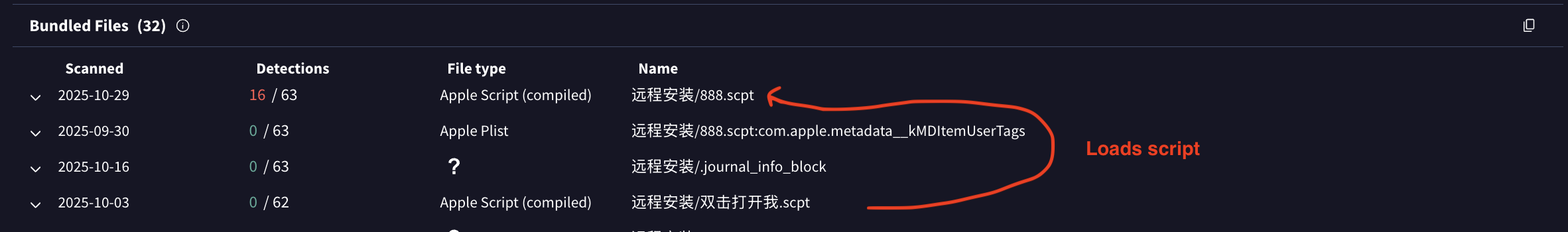 A similar example has been previously analyzed by SentinelOne, and we can see the the hidden AppleScript in <file>/..namedfork/rsrc
