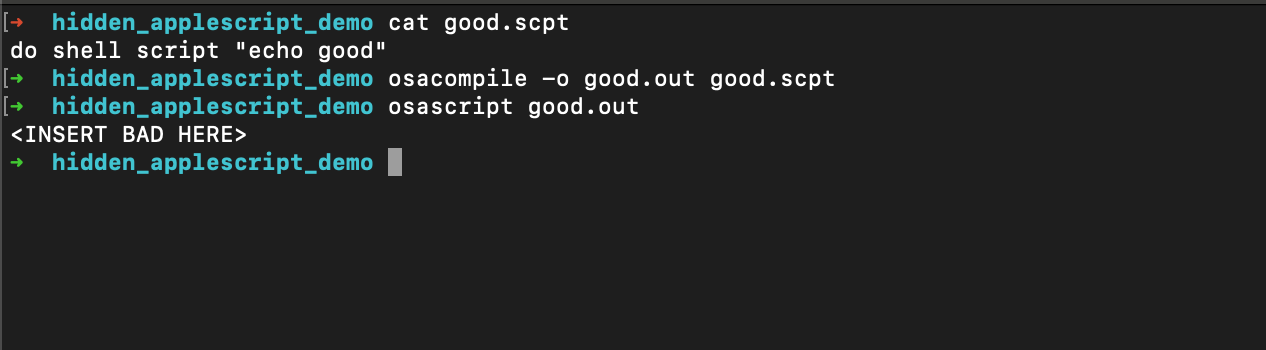 Running the commands above, you can see that after osascompile, the hash of good.scpt is unchanged 95504cde5ca293ce1085282d58c6caaa. However, when osascript good.scpt is executed, the hidden payload is what is executed.