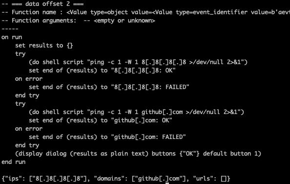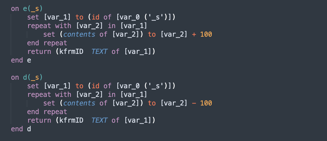 Using applescript_decompile, we recover the readable source code. The output is close enough to real AppleScript that syntax highlighting works. The source of 3864…555d matches with the one mentioned here