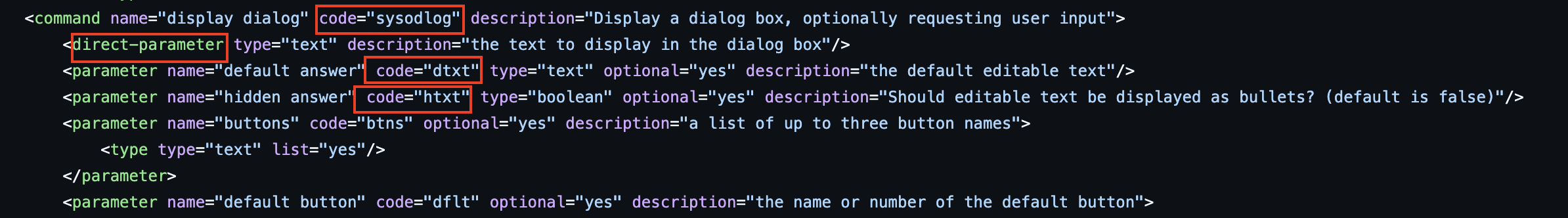 Depending on what the target is, these keywords (such as dlog, stvl, dtxt, htxt, …) can be looked up in an .sdef file or the Apple Event Codes.