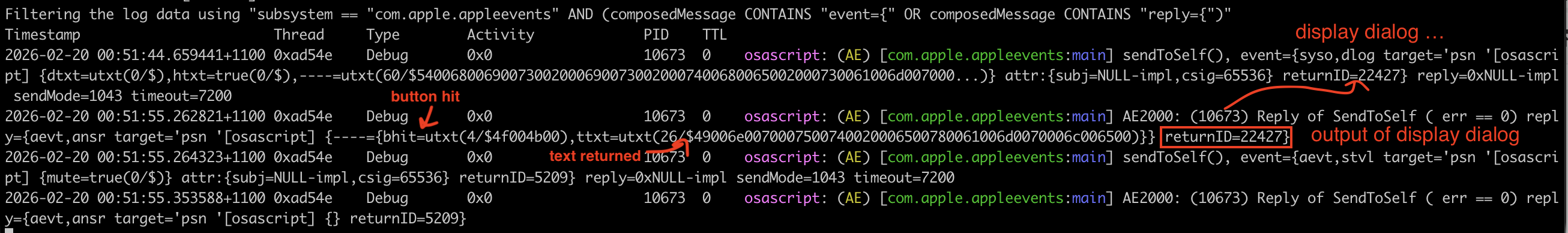 Now, the sysodlog event refers to the Apple event that creates a prompt to the user. The aevtansr event is the output of display dialog, which captures which button was clicked and what text the user entered. We are able to link the two events through the returnID=22427 field.