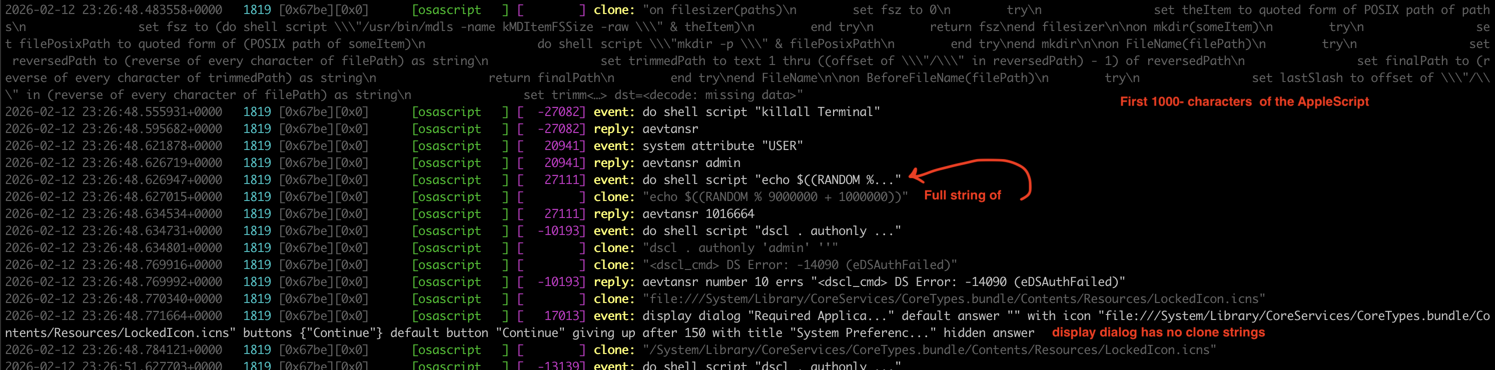 The strings in clone... get truncated at around 1000 characters and if we combine these with the raw of the the events we have, we get a pretty good picture of the actions that was done by `osascript.