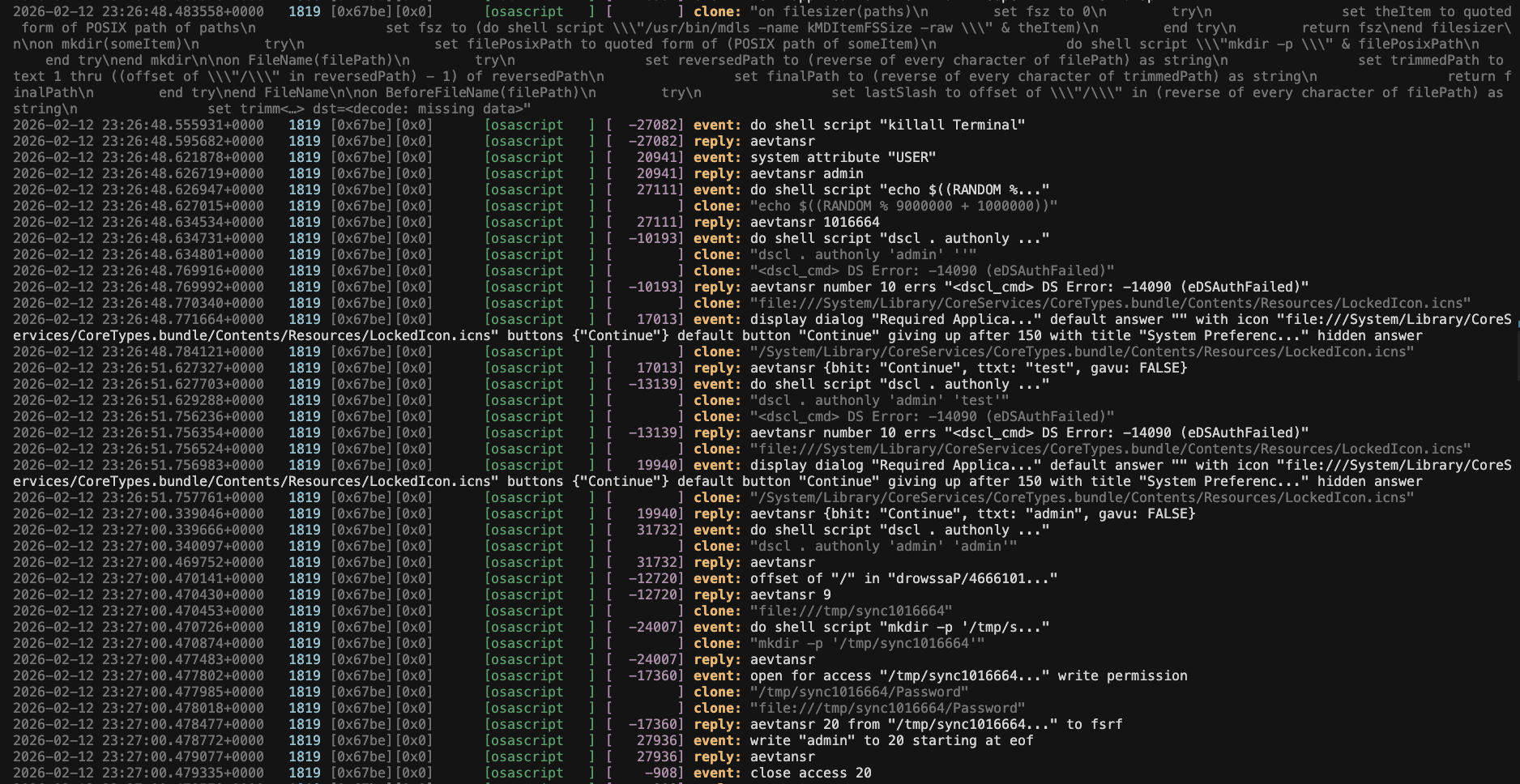 | Fake Password Prompt | osascript -e ... display dialog ... with hidden answer and password |