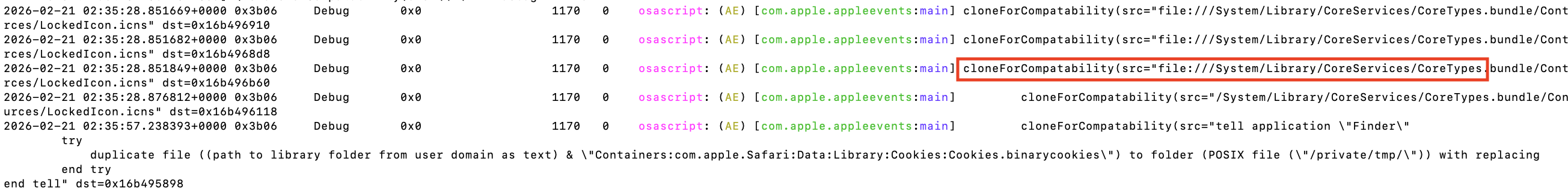 The strings in clone... get truncated at around 1000 characters and if we combine these with the raw of the the events we have, we get a pretty good picture of the actions that was done by `osascript.