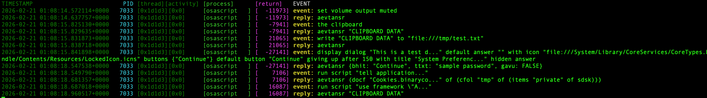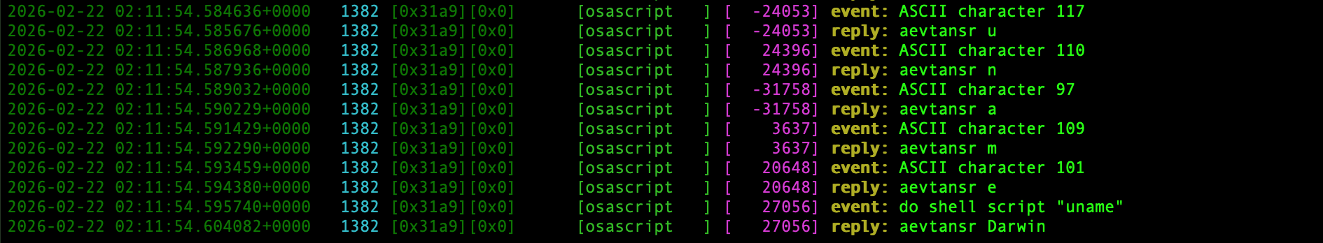 A key insight I got from working on the AppleScript decompiler is that many actions performed via osascript are just Apple events under the hood. When you run display dialog "...", the AppleScript runtime translates it into Apple events that get sent between applications. If we can observe events at the Apple event layer, we can monitor this behavior regardless of whether the script came from osascript -e, a compiled .scpt file, or Script Editor.