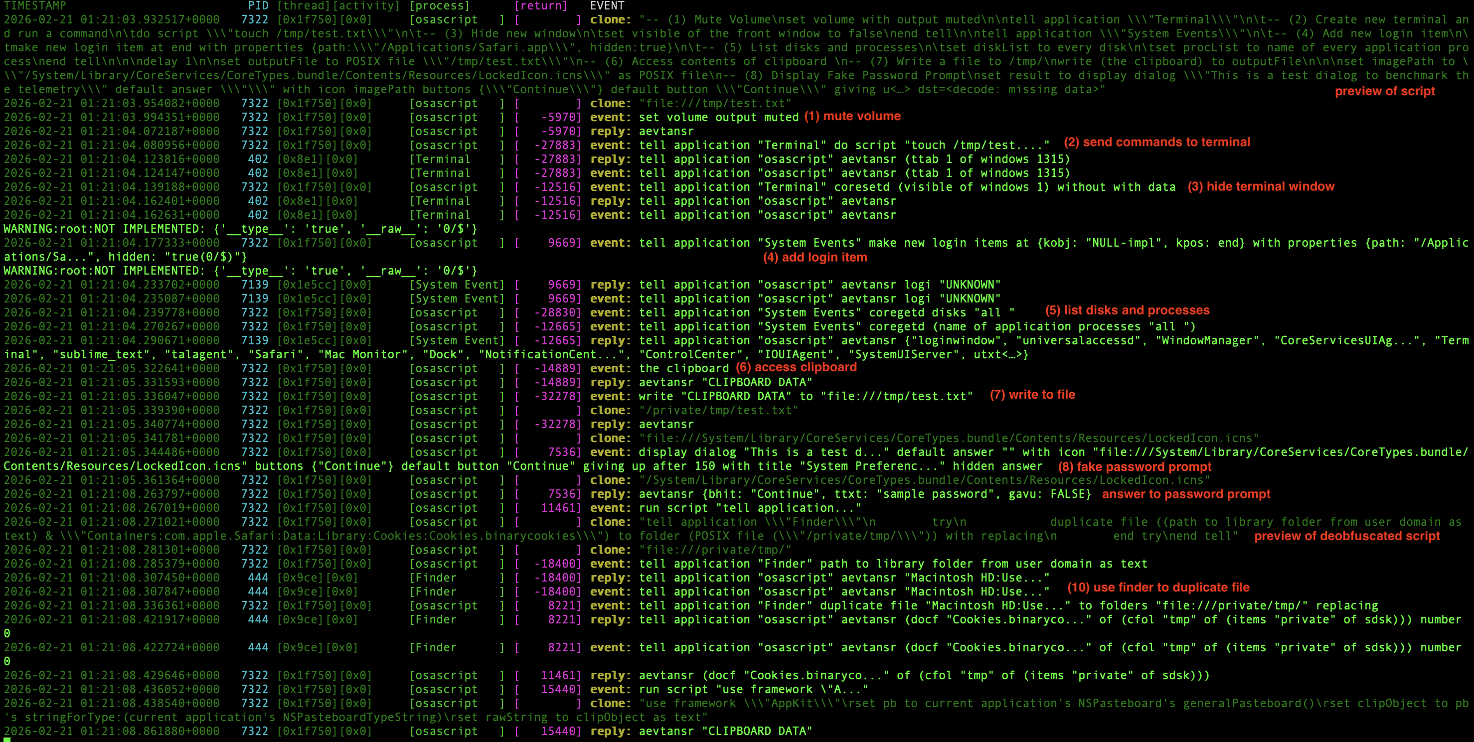 This post demonstrates how we can use macOS Unified Logs to monitor for Apple event debug logs. With these logs, we can observe activities that were difficult to piece together with just process creation and file creation events. AEMonitor is a tool that allows us to stream and parse these Apple event debug logs and recover pseudocode using my previous AppleScript decompiler research.